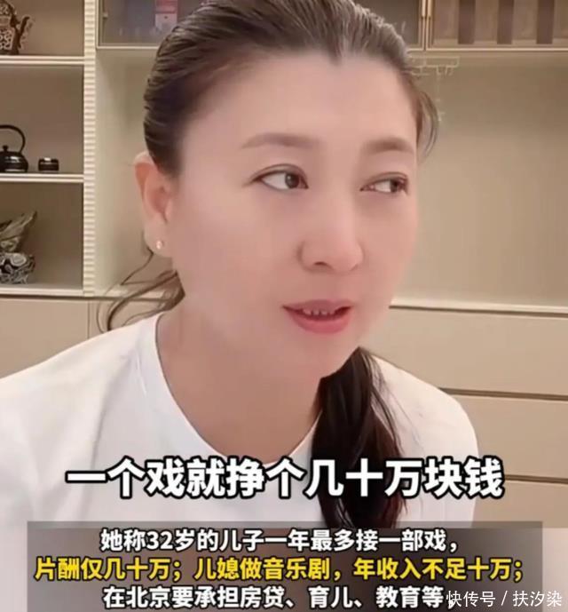 不仅如此,她还跟粉丝细细算了一笔家庭开支账: 儿子一年得赚百八十万,整个家才能正常运转,可他接一部戏只能挣几十万。 儿媳是演音乐剧的,收入更低。 两人的收入加起来,仅“几十万”。